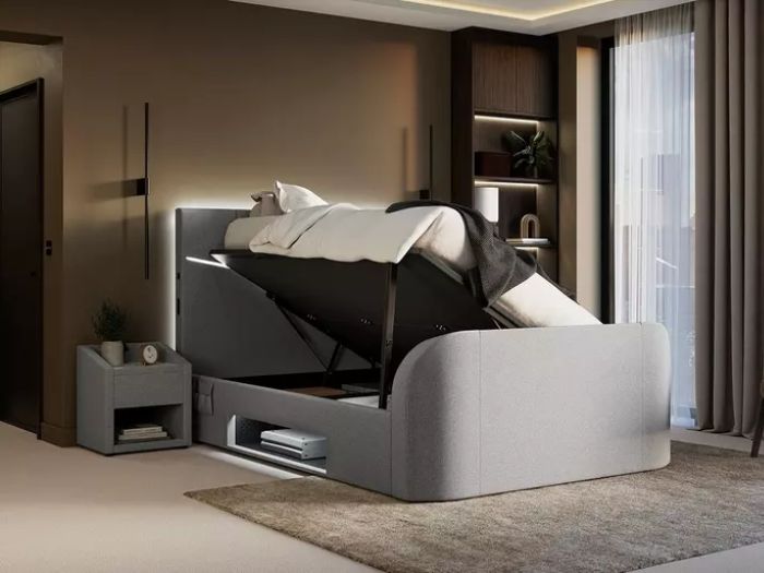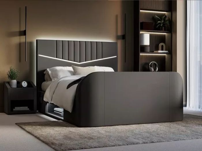 The Quantum’s built-in lighting illuminates the headboard and media tray, casting light onto the wall behind the bed to add instant atmosphere.